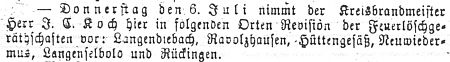 Donnerstag den 6. Juli nimmt der Kreisbrandmeister Herr J. C. Koch hier in folgenden Orten Revision der Feuerlöschgeräthschaften vor: Langendiebach, Ravolzhausen, Hüttengesäß, Neuwiedermus, Langenselbold und Rückingen." Ausschnitt aus der Zeitung |